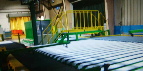 從擠出機排出的合格胎面通過定中及輸送輥床、單條胎面橫向定位組合傳送帶、多條胎面導(dǎo)出輸送帶、活動導(dǎo)入指型輸送輥道、液壓升降平臺,將胎面裝入格柵車。以備轉(zhuǎn)入成型機工序。
